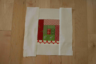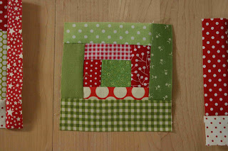 First, make 15 little log cabin blocks. I basically used this method, but I didn't use those measurements. I used tiny scraps from my scrap bucket. The finished log cabin squares range in size from to 3.75" x 4.25" to 5" x 6".