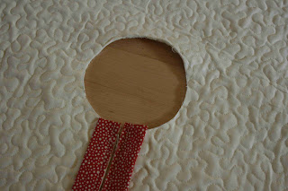 cut out a piece of paper into a circle 5" in diameter and pin it to the center. Trace around it onto the fabric. Cut out the center circle, also make a slit to the edge. I used masking tape to mark my line for cutting to the edge then removed the tape immediately afterward.